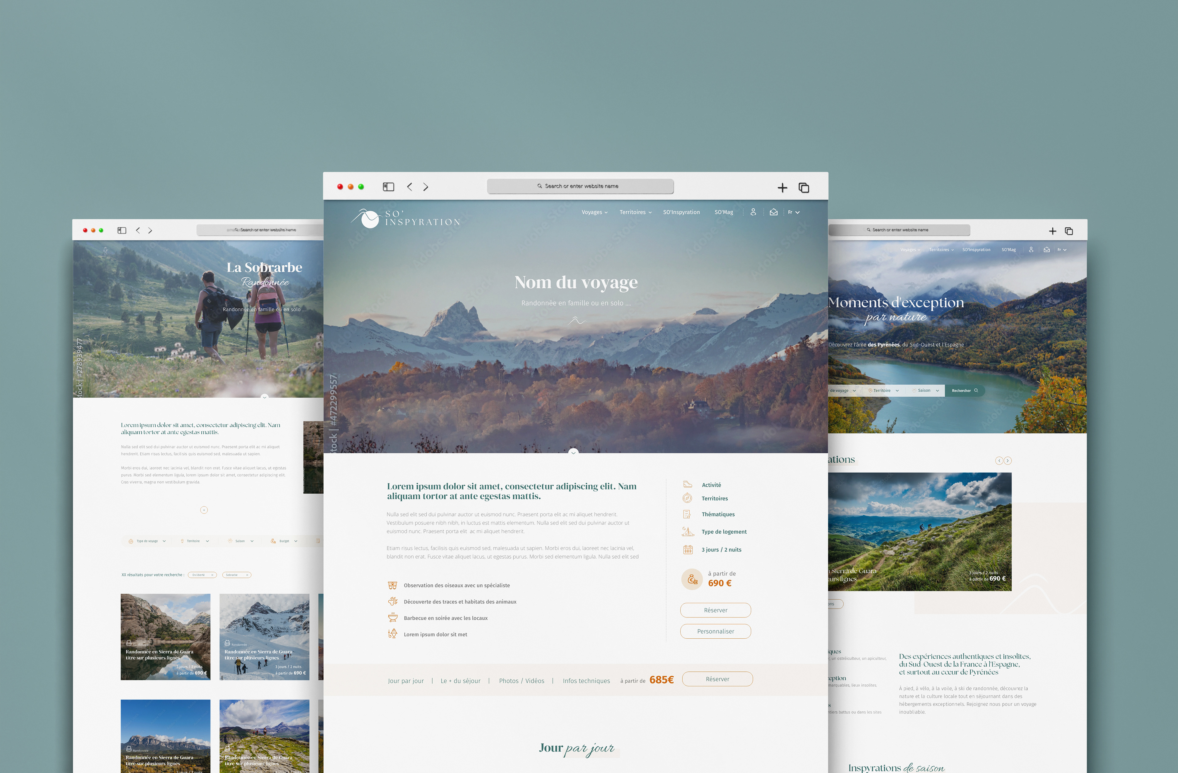 Dans le cadre d’une collaboration avec une agence de communication, j’ai conçu l’ensemble des maquettes graphiques de ce site internet dédié aux séjours à faire en famille ou en solo dans les Pyrénées.