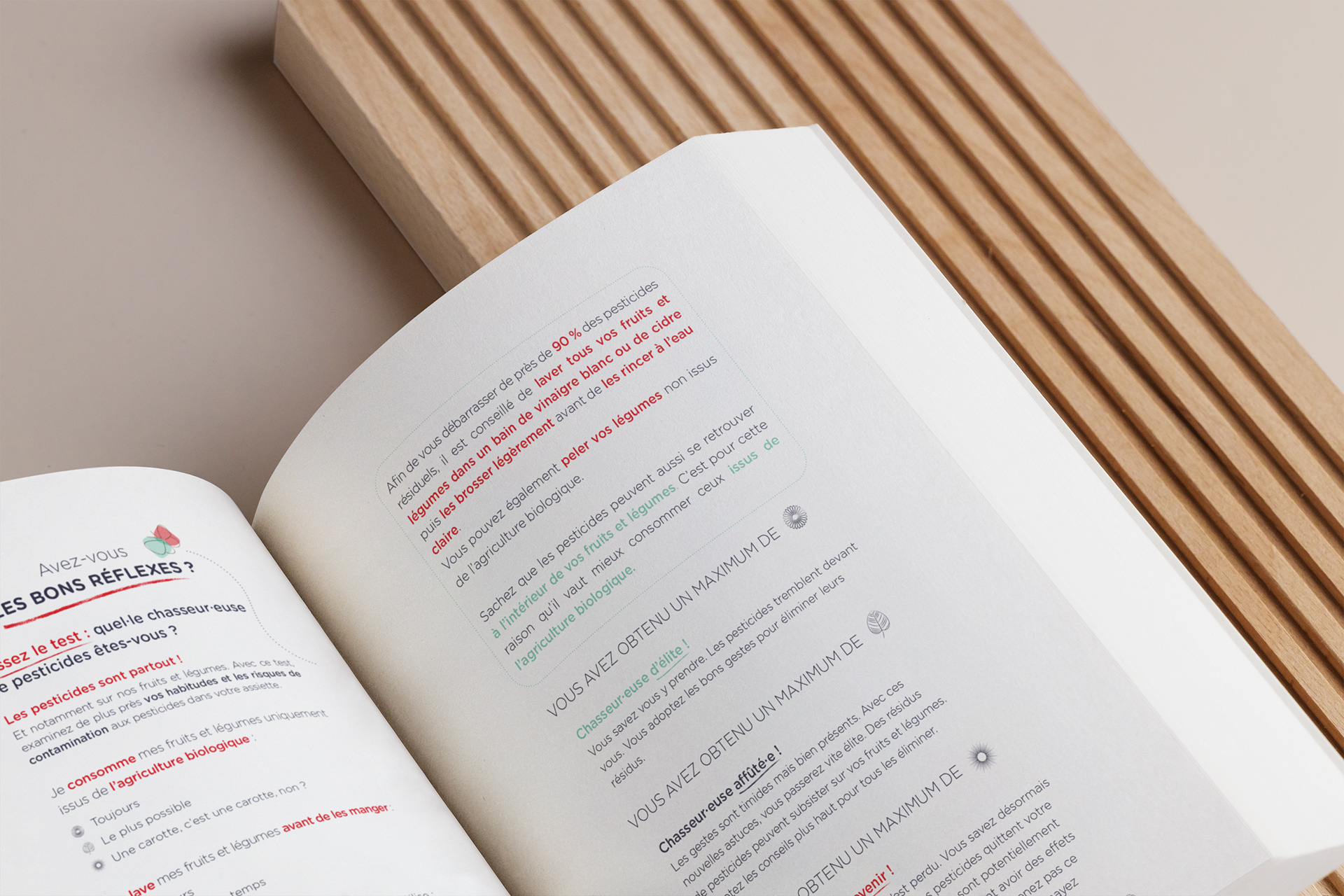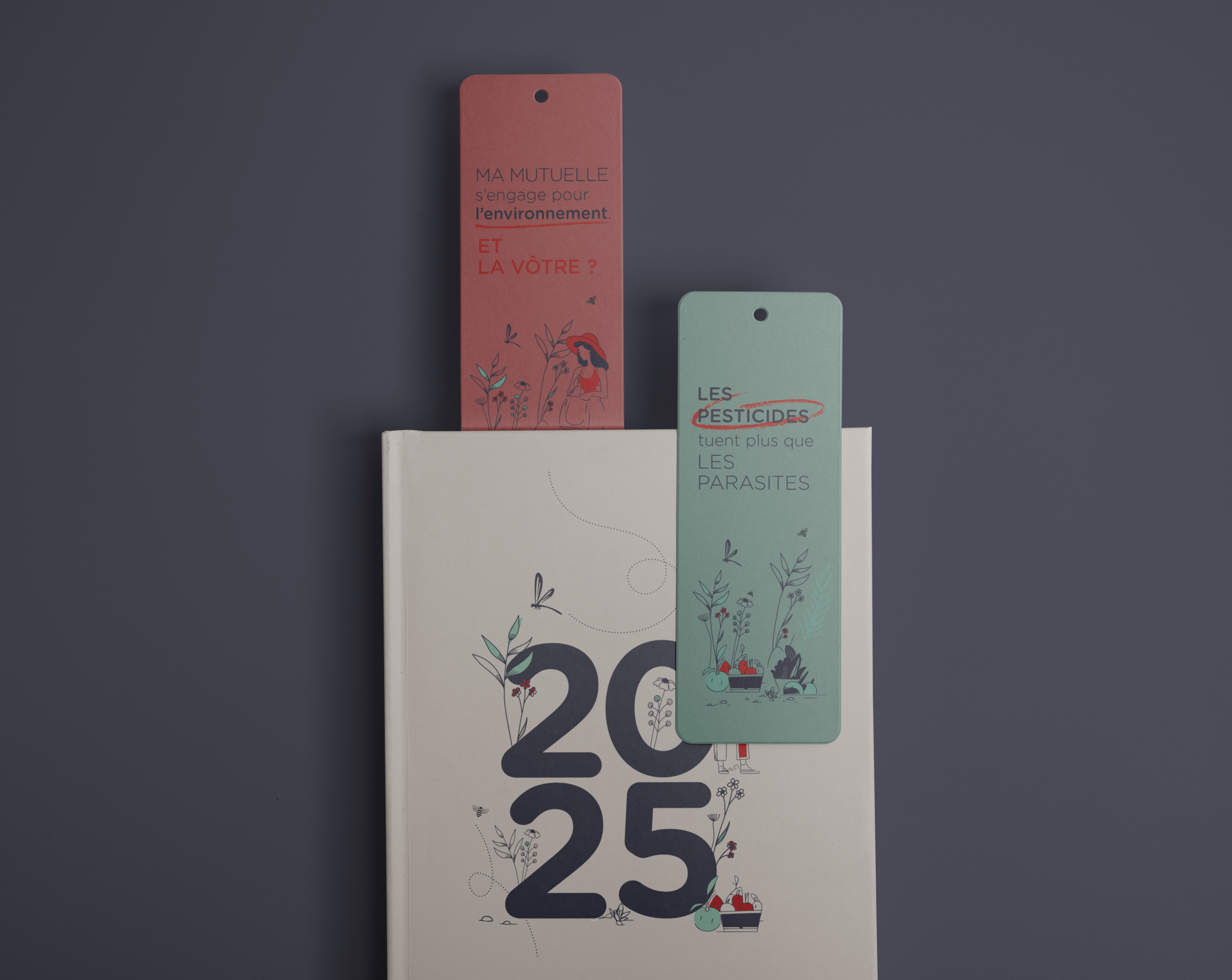 Ces projets prennent des formes variées : création de brochures imprimées sur papier recyclé pour présenter des alternatives aux modèles existants, conception d’agendas engagés mettant en avant des causes environnementales, comme la lutte contre les pesticides. Les illustrations privilégient des traits fins, des touches de couleur mesurées et des choix graphiques pensés pour limiter l’encrage, sans renoncer à l’impact visuel.
